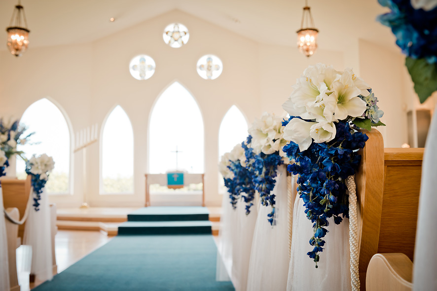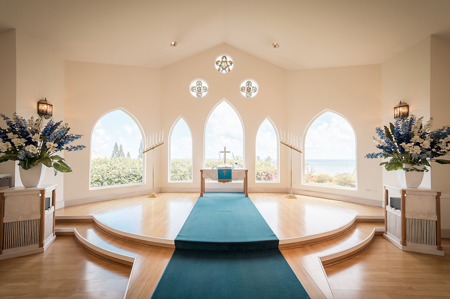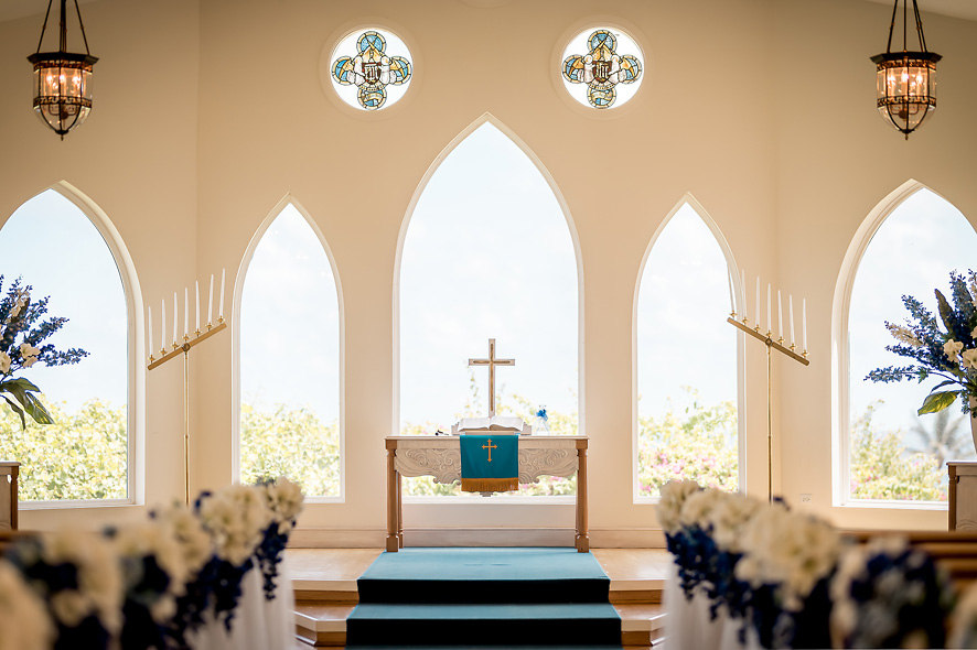 채플 내부는 오션뷰가 보이는 아치형 창문들이 정면과 사이드에 있어서 밝고 깔끔한 느낌이에요.